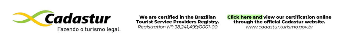 We are registered with Cadastur, the Tourist Service Providers Registry of the Brazilian Ministry of Tourism. This demonstrates our commitment to offering high-quality services in compliance with industry regulations, providing our customers with safe and reliable tourist experiences.